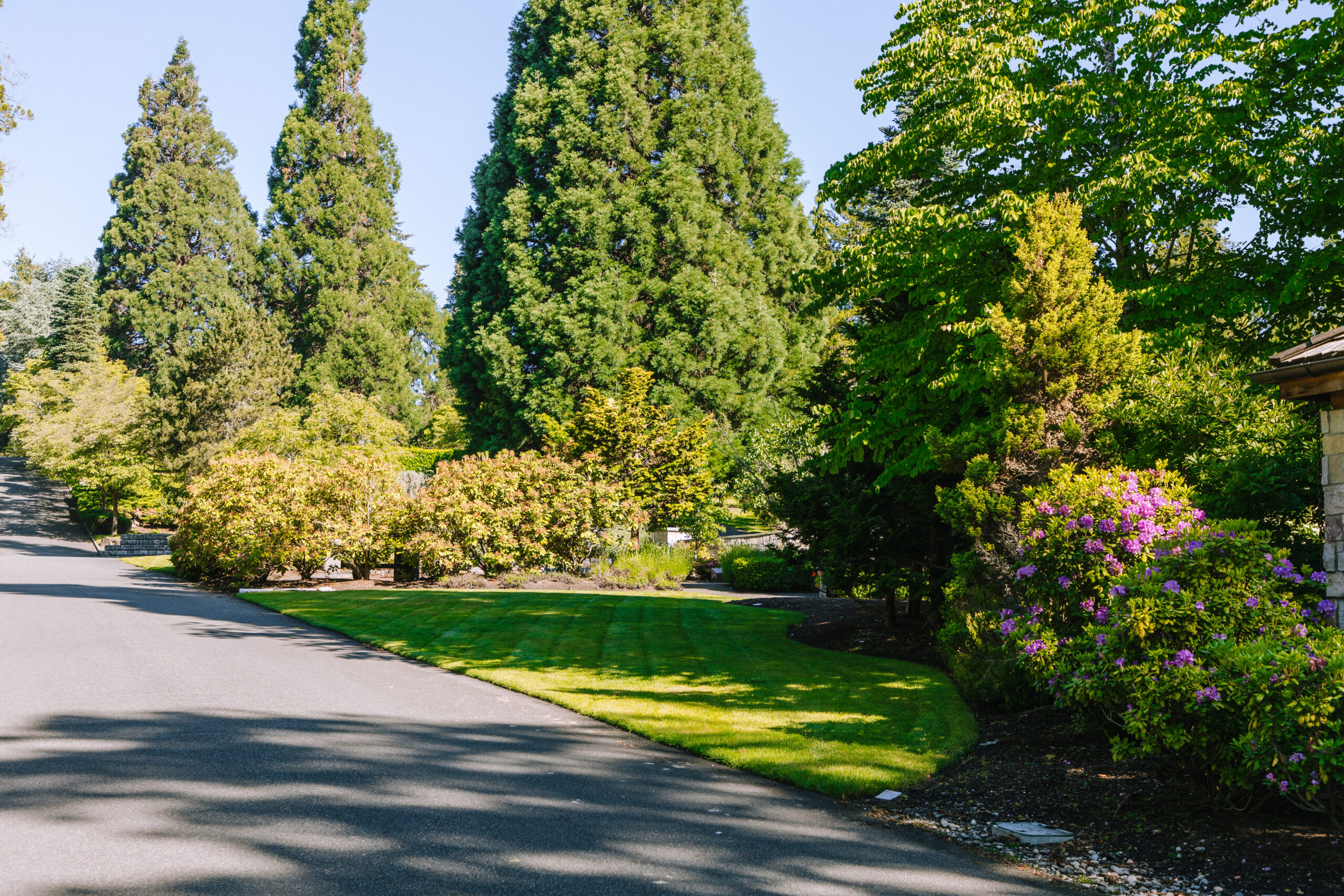 Our team uses special equipment, intricate mow patterns, and a complex bagging system in order to properly maintain the property and avoid damaging markers, headstones, or other monuments. Due to the cemetery’s proximity to the Pacific Ocean, the weather is also often gloomy and rainy. With inclement weather being commonplace in the locale, our team finds it necessary to line-trim certain areas of the property to keep the landscape looking neat without causing damage to the turf.