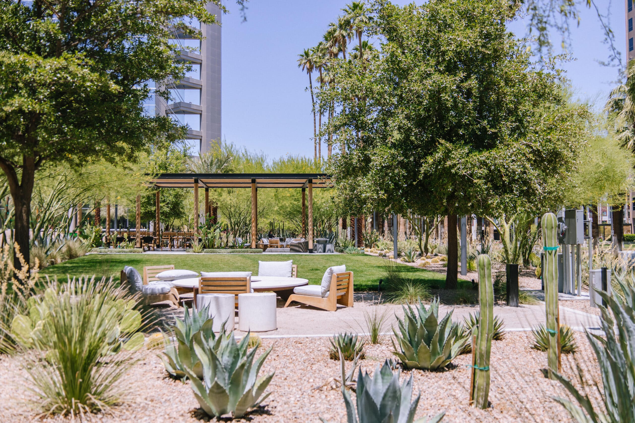 Contained on a 75-acre campus, Hughes Center boasts 10 mid- and high-rise office buildings, luxury condos and apartment complexes, high-end dining and retail stores, and a Marriott hotel. In 2020 the property underwent a major renovation to create a usable outdoor space that would simultaneously strengthen the brand and foster community and collaboration for its guests.