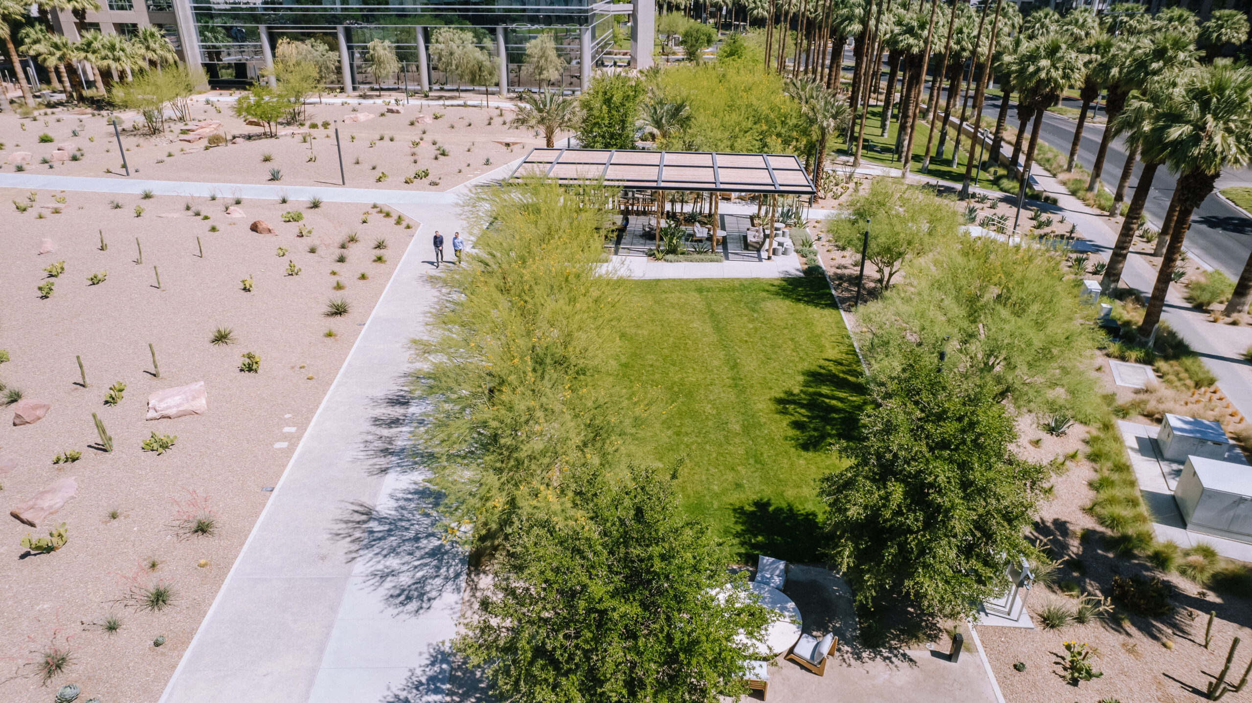 1)Due to the desert climate in Nevada and the tall glass building next door that often reflects both excessive sunshine and heat onto the Hughes Center property, our team had to be intentional about the trees that were selected and installed. Initially, the design of the property incorporated Oak trees which are sensitive to heat; however, due to their understanding of the environment and result of the sun reflecting off the neighboring building, our team suggested to alternatively install Acacia trees, which are much more resilient in the desert climate.